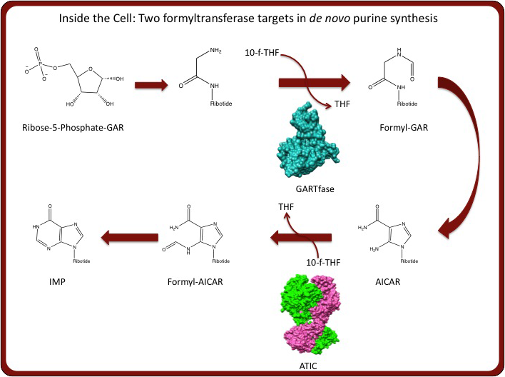 Additionally, new enzyme targets for antifolates have emerged beyond the traditional targets – dihydrofolate reductase (DHFR) and thymidylate synthase (TS). Specifically, we are interested in antifolates that target either aminoimidazole-4-carboxamide ribonucleotide transformylase/IMP cyclohydralase (ATIC) or glycinamide ribonucleotide transformylase (GARTfase), enyzymes that transfer a formyl group from 10-formyl-tetrahydrofolate to aminoimidazole-4-carboxamide (AICAR) or glycinamide ribonucleotide (GAR), respectively (see above). We are currently performing enzymatic and structural analysis of the aforementioned FR-targeted antifolates with the ATIC and GARTfase enzymes to yield data for design and optimization of new antifolates. Stated simply, we are interested in the development of new drugs that are transported via FRs and inhibit ATIC or GARTfase and are performing directed biochemical and biophysical studies to achieve this goal.